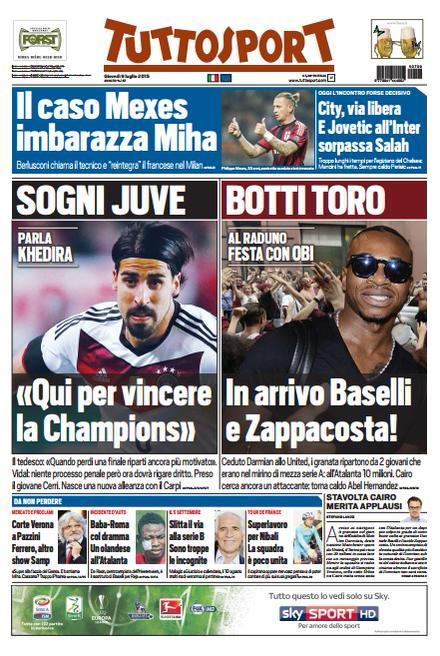 Prima pagina divisa a metà, oggi, giovedì 9 luglio, su Tuttosport: nella prima metà intervista a Khedira: “Alla Juve per vincere la Champions“, sulla seconda metà il mercato targato Torino: “In arrivo Baselli e Zappacosta!“.
