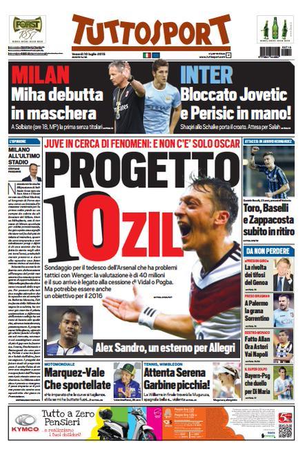 Titolo dedicato alla Juventus sulla prima pagina di oggi, venerdì 10 luglio, di Tuttosport: “Progetto Ozil“. Juve in cerca di fenomeni, non solo Oscar nel mirino. In taglio alto spazio all’Inter: “Bloccato Jovetic, Perisic in mano!“.