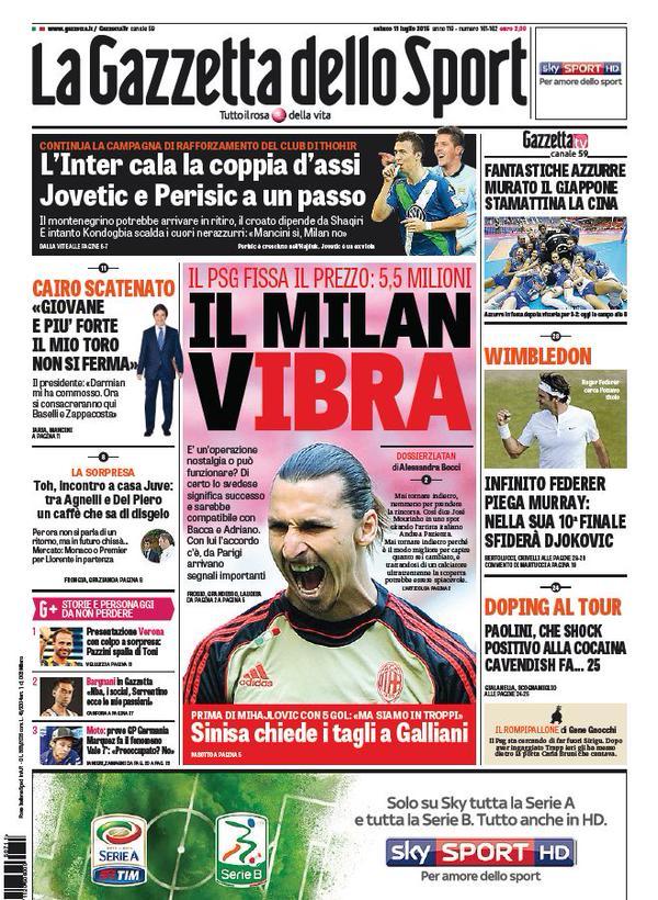 Gioco di parole in prima pagina oggi, sabato 11 luglio, della Gazzetta dello Sport: “Il Milan V-Ibra“. Il riferimento è all’asso del Psg Ibrahimovic per il quale sarebbero pronti 5,5 milioni da parte del Milan per strapparlo al club francese.