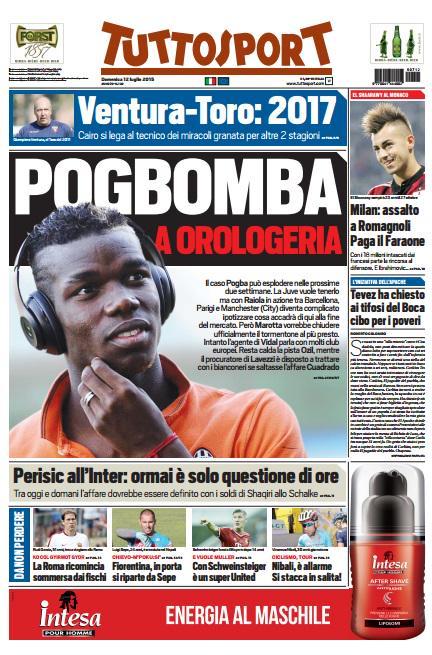 Gioco di parole sulla prima pagina di oggi, domenica 12 luglio, di Tuttosport: “Pogbomba a orologeria“, il riferimento è alla possibilità che Paul Pogba possa lasciare la Juventus già in questa finestra di mercato. In taglio alto il Torino che rinnova il contratto del tecnico Ventura fino al 2017.