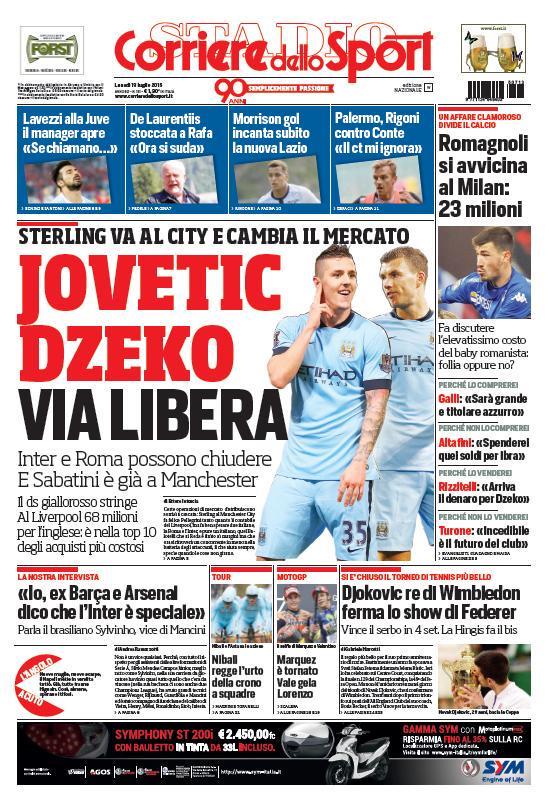Intrecci di mercato sulla prima pagina di oggi, lunedì 13 luglio, del Corriere dello Sport: “Sterling va al City e sblocca il mercato. Dzeko e Jovetic, via libera“. Roma e Inter pronte a chiudere per i due attaccanti. Di spalla il Milan che offre 23 milioni per Romagnoli.