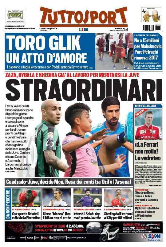 Titolo dedicata alla Juventus in primo piano, sulla prima pagina di oggi, lunedì 13 luglio, di Tuttosport: “Straordinari“, il riferimento è ai nuovi acquisti della Juventus, Zaza, Dybala e Khedira, che si sono presentati in anticipo in ritiro. In taglio basso la notizia dell’interessamento della Fiorentina per Balotelli, divide la città.
