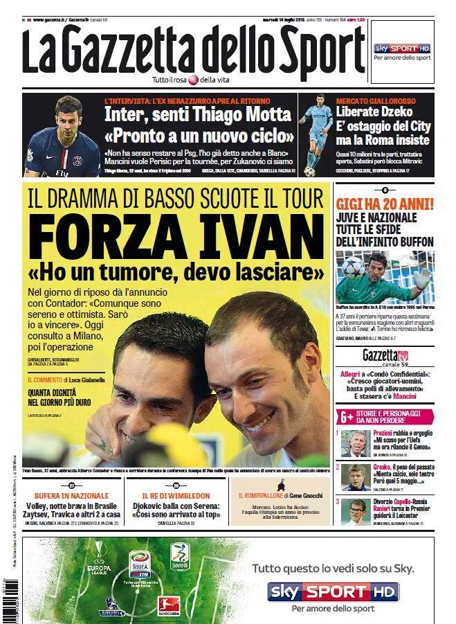 È il dramma di Ivan Basso ad occupare il primo piano, della prima pagina di oggi, martedì 14 luglio, della Gazzetta dello Sport: “Ho un tumore, devo lasciare”.