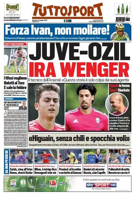 Titolo sulla Juventus sulla prima pagina di oggi, martedì 14 luglio, di Tuttosport : “Juve-Ozil, ira Wenger”. Il tecnico dei Gunners non ha gradito i contatti che la società bianconera ha avuto con il centrocampista tedesco.