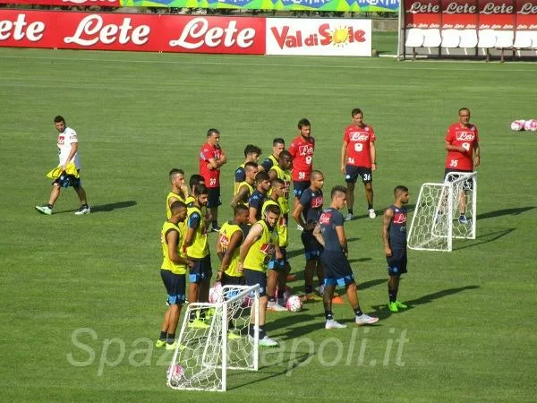 17:50 Iniziata la partitella: Napoli giallo (Ghoulam, Luperto, Albiol, Maggio, David Lopez, Valdifiori, De Guzman, El Kaddouri, Callejon, Duvan) contro Napoli blu (Henrique, Koulibaly, Britos, Strinic, Inler, Jorginho, Hamsik, Mertens, Gabbiadini, Insigne). Tanti gol e belle verticalizzazioni per gli azzurri, sotto gli attenti occhi di Sarri. Lavoro personalizzato per Rafael
