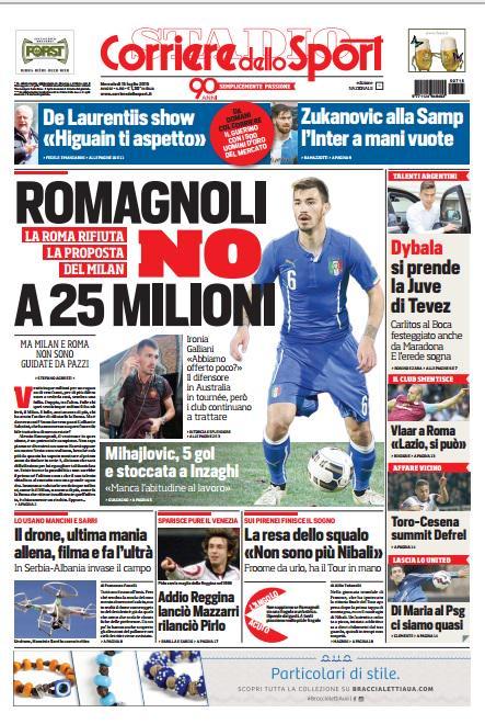 Primo piano dedicato al Milan sulla prima pagina di oggi, mercoledì 15 luglio, del Corriere dello Sport: “La Roma rifiuta 25 milioni per Romagnoli“.