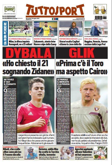 Primo piano dedicato a Juventus e Torino sulla prima pagina di oggi, mercoledì 15 luglio, di Tuttosport: “Dybala vuole la 21 sognando Zidane“. In casa granata parla capitan Glik: “Prima c’è il Toro, ma aspetto Cairo“.