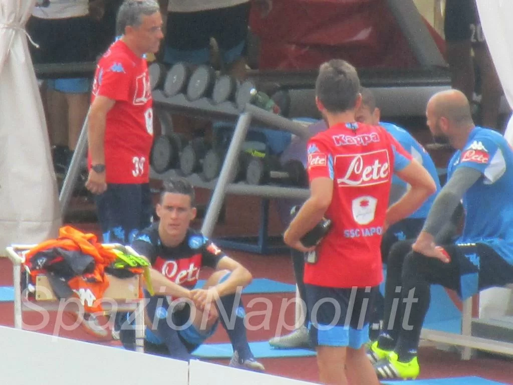 ore 11.15 Allenamento terminato quasi per tutti, pochissimi azzurri ancora in palestra. Hamsik, all’uscita, era dolorante per una botta alla caviglia.