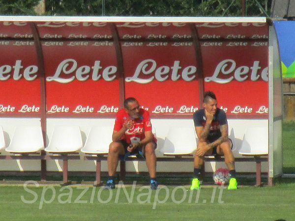 ore 17.52 Inizia la partitella in famiglia a campo ridotto. Come sempre verdi contro blu. Per i primi in porta Reina; Henrique, Albiol, Lupert, Ghoulam, Inler, Valdifiori, Jorginho; Gabbiadini, Mertens, Insigne. Per i blu Rafael; Maggio, Koulibaly, Britos, Strinic, David Lopez, Jorginho, De Guzman, El Kaddouri, Callejon, Duvan.