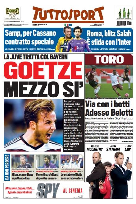 Nel taglio alto attenzione alla trattativa che potrebbe riportare Cassano alla Samp e l’intrigo Salah con la sfida Roma-Inter.