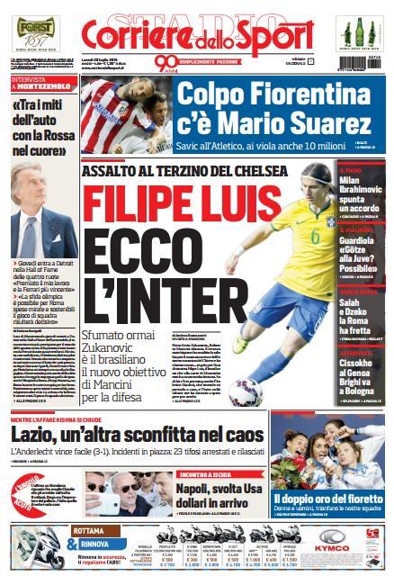Si apre con una clamorosa notizia di mercato l’edizione di oggi, lunedì 20 luglio, del Corriere dello Sport: “Filipe Luis, ecco l’Inter. Il brasiliano è il nuovo obiettivo di Mancini“. In taglio alto la Fiorentina che piazza il colpo Mario Suarez.