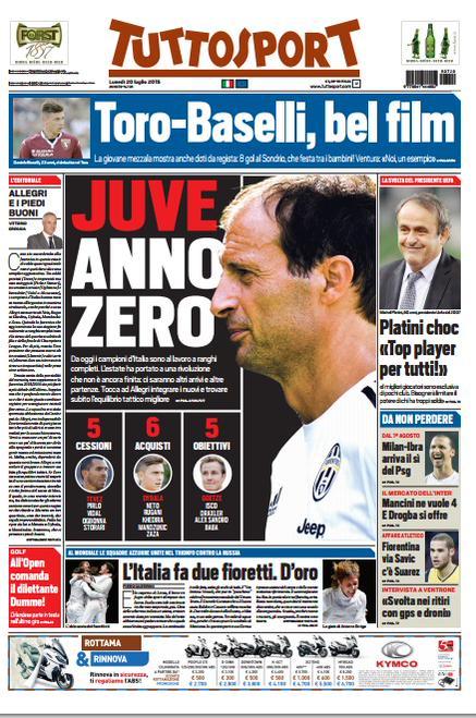 Focus sul mercato della Juventus sulla prima pagina di oggi, lunedì 20 luglio, di Tuttosport: “Juve, è l’anno zero“. Poi piccolo grafico che riporta tutti i movimenti di mercato dei bianconeri.