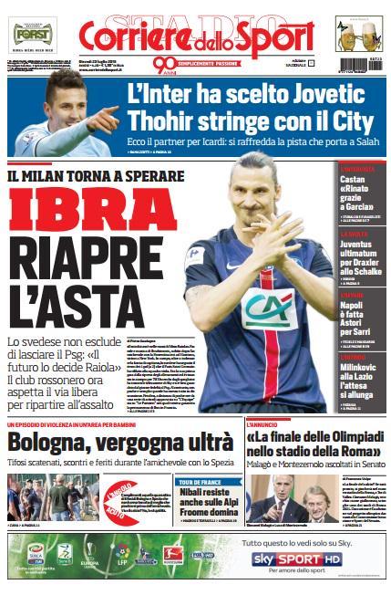 L’affare Ibrahimovic in primo piano sulla prima pagina di oggi, giovedì 23 luglio, del Corriere dello Sport: “Ibra riapre l’asta, il Milan torna a sperare“. In taglio alto l’Inter che ha scelto Jovetic per l’attacco: “Thohir stringe con il City“.