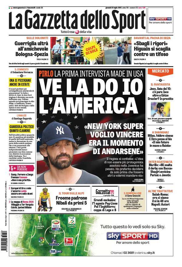 Intervista ad Andrea Pirlo sulla prima pagina di oggi, giovedì 23 luglio, della Gazzetta dello Sport: “Ve la do io l’America. Era il momento giusto per andarsene“. Di spalla la Juventus e la ricerca del trequartista: “C’è anche Isco nella lista“.