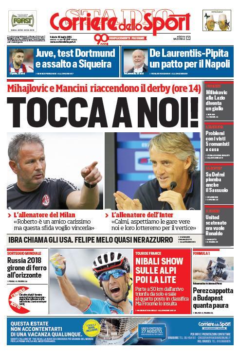 Il derby amichevole tra Inter e Milan in prima pagina oggi, sabato 25 luglio, sul Corriere dello Sport: “Tocca a noi! Mancini e Mihajlovic riaccendono il derby“. Di spalla c’è la Lazio con Milinkovic che diventa un giallo, e il Sassuolo che punta forte su Defrel.