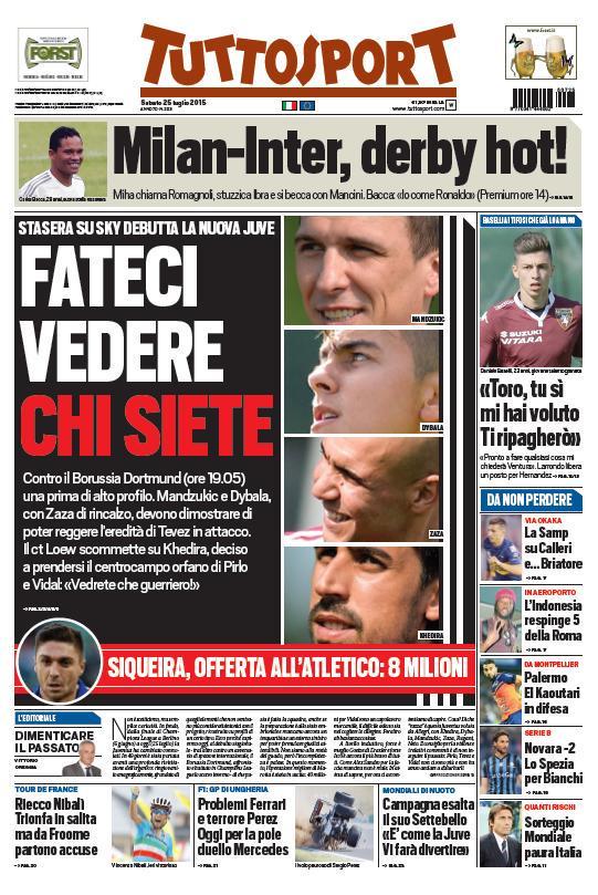 La Juventus in primo piano, sulla prima pagina di oggi, sabato 25 luglio, di Tuttosport: “Fateci vedere chi siete“, il riferimento è ai nuovi acquisti bianconeri che sfidano in amichevole il Borussia Dortmund. Intanto Marotta offre 8 milioni per Siqueira dell’Atletico Madrid.