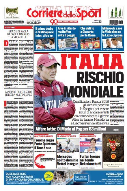 I sorteggi per il mondiale in Russia del 2018 in primo piano, sulla prima pagina di oggi, domenica 26 luglio, del Corriere dello Sport: “Italia, rischio mondiale. Gli azzurri pescano la Spagna: per essere sicuri di andare avanti dovremo vincere il girone“. In taglio basso notizia di mercato estero con Di Maria che passa dal Manchester United al Psg per una cifra record di 63 milioni di euro.