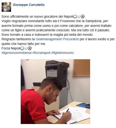 Un classe 1997 dalle grandi prospettive, dal talento indiscusso, ricco di grinta e motivazioni. Giuseppe Carcatella è un nuovo rinforzo della Primavera del Napoli, lasciando Frosinone e Sampdoria dove è stato tra gli indiscussi protagonisti. Bellissimo il messaggio scritto dal giovane su Facebook, che ufficializza così il passaggio al Napoli.