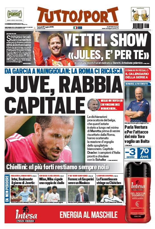 Apertura dedicata alla polemica scatenata su Twitter tra Nainggolan e i tifosi della Juventus, sulla prima pagina di oggi, lunedì 27 luglio, di Tuttosport: “Juve, rabbia capitale. Da Garcia a Nainggolan: la Roma ci ricasca“. Intanto arriva la risposta di Chiellini al centrocampista della Roma: “I più forti restiamo sempre noi“.