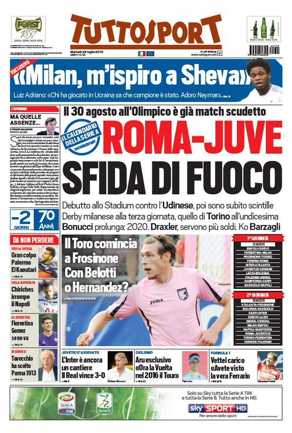 Il calendario 2015/2016 della Serie A in prima pagina oggi, martedì 28 luglio, su Tuttosport: “Roma-Juve, sfida di fuoco. Il 30 agosto all’Olimpico è già sfida scudetto“. In taglio basso il Torino che nella prima giornata affronterà il Frosinone con il dilemma sulla prima punta: “Belotti o Hernandez?“.