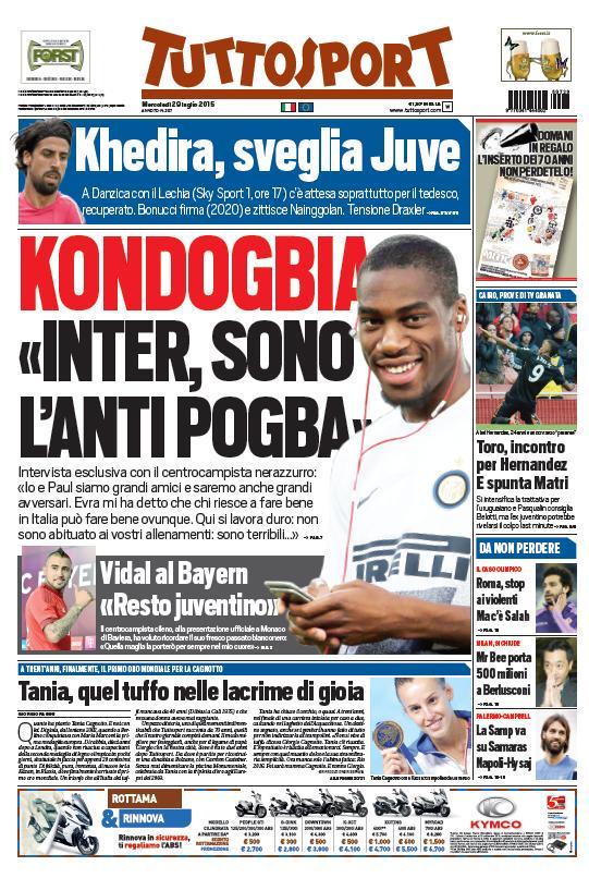 Intervista esclusiva a Kondogbia sulla prima pagina di oggi, mercoledì 29 luglio, di Tuttosport: “Inter, sono l’anti Pogba“. Il neo acquisto dell’Inter lancia la sfida alla Juventus. Di spalla il Torino che prova a chiudere per Hernandez, e intanto spunta l’ipotesi Matri.