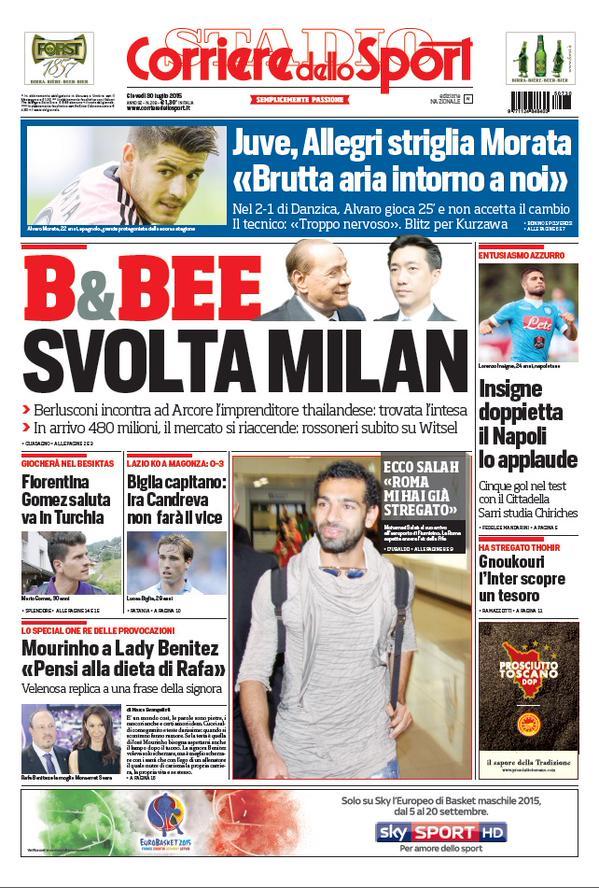 L’intesa tra Berlusconi e Mr. Bee per la cessione di una parte delle quote del Milan in prima pagina oggi, giovedì 30 luglio, sul Corriere dello Sport: “B&Bee, svolta Milan“. A Roma sbarca Salah che dichiara: “Roma, mi hai già stregato“.