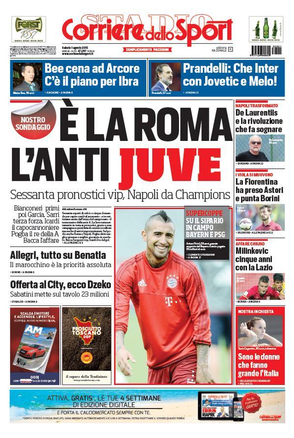 Sondaggio con sessanta pronostici vip sulla prima pagina di oggi, sabato primo agosto, del Corriere dello Sport: “È la Roma l’anti-Juve, Napoli da Champions“. In taglio alto intervista all’ex CT della nazionale italiana Cesare Prandelli: “Che Inter con Jovetic e Melo!“.