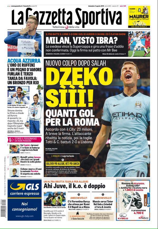 Trattativa vicina alla conclusione tra la Roma e il City per Dzeko, in prima pagina oggi, domenica 2 agosto, sulla Gazzetta dello Sport: “Dzeko sììì! Nuovo colpo dopo Salah, quanti gol per la Roma“. In taglio alto la vittoria del Psg nella Supercoppa di Francia ai danni del Lione con una grande prestazione di Zlatan Ibrahimovic: “Milan, hai visto Ibra?“.