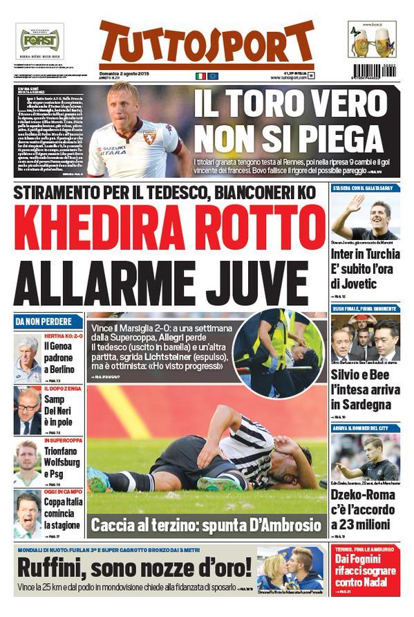 L’infortunio di Khedira nella sconfitta della Juventus in amichevole contro il Marsiglia (2-0, ndr) sulla prima pagina di oggi, domenica 2 agosto, di Tuttosport: “Khedira rotto, allarme Juve. Stiramento per il tedesco, bianconeri KO“.