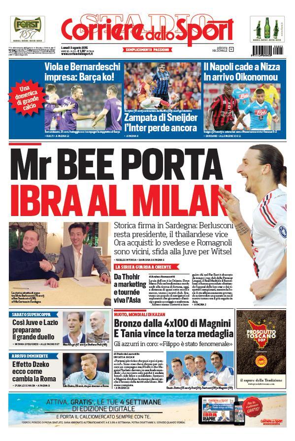 “Mr Bee porta Ibra al Milan“, questo il titolo in prima pagina oggi, lunedì 3 agosto, sul Corriere dello Sport: “Storica firma in Sardegna: Berlusconi resta presidente, il thailandese sarà il vice. Ora acquisti: lo svedese e Romagnoli sono vicini, sfida alla Juve per Witsel“.