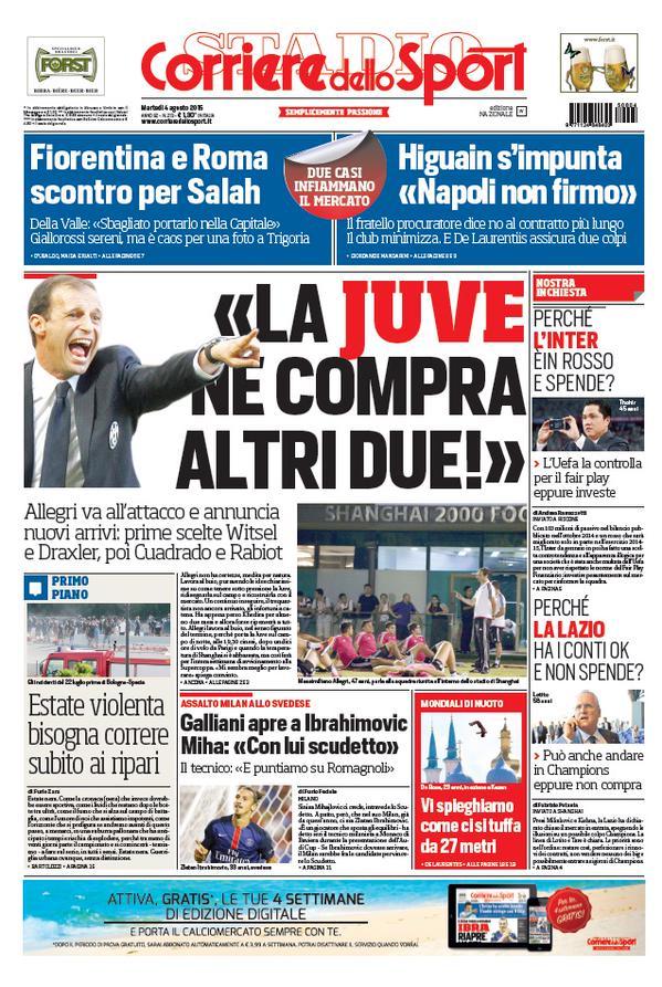 Il mercato della Juventus con le parole di mister Allegri, in prima pagina oggi, martedì 4 agosto, sul Corriere dello Sport: “La Juve ne compra altri due!“. Così il tecnico dei bianconeri che annuncia nuovi colpi di mercato: Witsel e Draxler le prime scelte, poi Cuadrado e Rabiot. Di spalla l’inchiesta condotta dal Corriere: “Perché l’Inter è in rosso e spende? L’Uefa la controlla per il fair play, eppure investe. Perché la Lazio ha i conti ok e non spende? Può andare in Champions, eppure non compra“.