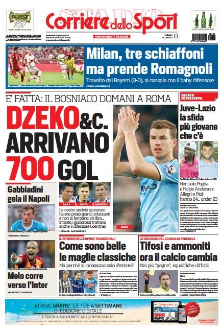 Il mercato della Roma sulla prima pagina di oggi, mercoledì 5 agosto, del Corriere dello Sport: “Dzeko&Co. Arrivano 700 gol. È fatta: il bosniaco domani a Roma. Le nostre società scatenate, hanno preso grandi attaccanti e non si fermano: c’è Ibra“. In taglio alto il Milan sconfitto in amichevole dal Bayern Monaco: “Milan tre schiaffoni, ma prende Romagnoli. Travolto dal Bayern (3-0), si consola con il baby difensore“.