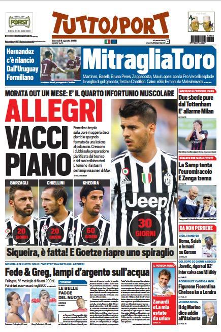 Spazio alla Juventus in primo piano, sulla prima pagina di oggi, giovedì 6 agosto, di Tuttosport: “Allegri vacci piano. Morata out un mese: è il quarto infortunio muscolare“. Di spalla c’è il Milan: “Due sberle pure dal Tottenham. È allarme Milan“.