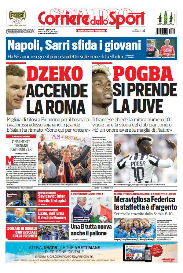 Juventus e Roma in primo piano sulla prima pagina di oggi, venerdì 7 agosto, del Corriere dello Sport: “Dzeko accende la Roma“, il titolo per i giallorossi; “Pogba si riprende la Juve“, quello dedicato ai bianconeri.
