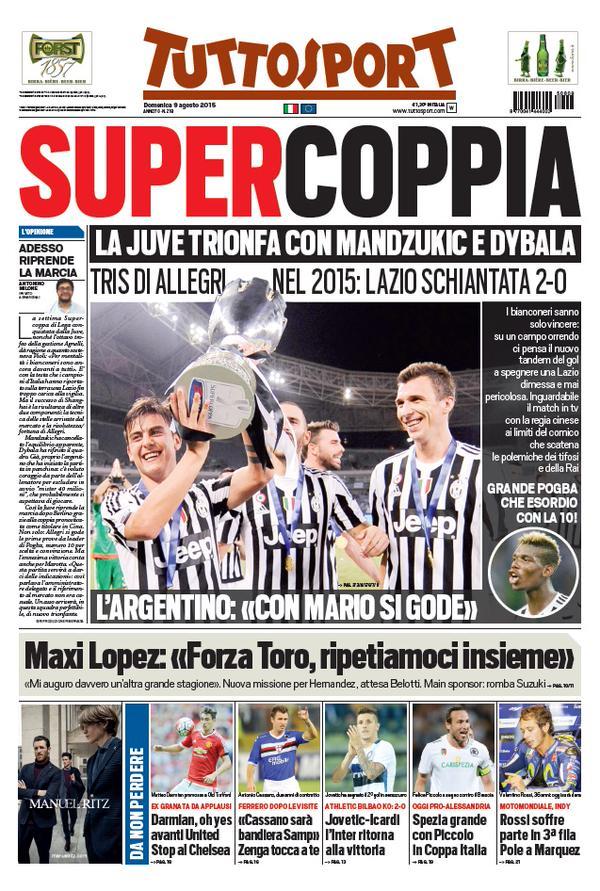 Apertura dedicata alla Juventus e alla vittoria della Supercoppa Italiana, in prima pagina oggi, domenica 9 agosto, su Tuttosport: “SuperCoppia. La Juve trionfa con Mandzukic e Dybala, Lazio schiantata 2-0“.