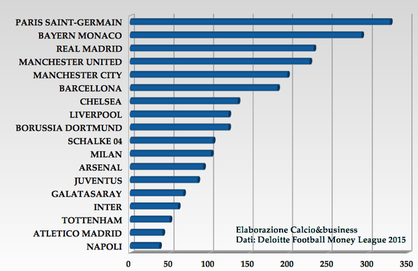 Il collega del Sole 24 Ore, Marco Bellinazzo, ha riportato sul proprio blog ufficiale una tabella, redatta da Deloitte, che mostra i ricavi commerciali delle principali squadre europee. In vetta volano PSG e Bayern Monaco, che con i recenti accordi guadagneranno circa 300 milioni. Indietro invece le italiane, con il Milan che mette in bilancio 102,1 milioni. La Juventus supera di poco la soglia degli 85 milioni, mentre l’Inter si ferma intorno ai 50.