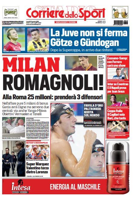 Apertura dedicata al mercato in prima pagina oggi, lunedì 10 agosto, sul Corriere dello Sport: “Milan: Romagnoli! alla Roma 25 milioni“. In taglio alto la Juventus: “La Juve non si ferma: Gotze e Gundogan. Dopo la Supercoppa, in arrivo due rinforzi“.