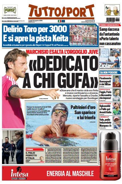 L’edizione odierna di Tuttosport apre la prima pagina di oggi, lunedì 10 agosto, con le dichiarazioni di Marchisio in merito alla vittoria della Supercoppa Italiana: “Dedicato a chi gufa“. In taglio alto spazio al Torino: “Delirio Toro per 3000. E si apre la pista Keita“.