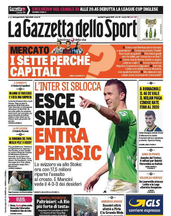 Il mercato dell’Inter in primo piano oggi, martedì 11 agosto, sulla prima pagina della Gazzetta dello Sport: “L’inter si sblocca: Esce Shaq, entra Perisic“. In taglio alto inchiesta della rosea che si pone sette domande definendole: “I sette perché capitali“, tra i quesiti anche: “Come riuscirà il Napoli a trattenere Higuain?“.