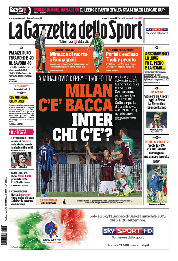 Il trofeo TIM in primo piano oggi, giovedì 13 agosto, sulla prima pagina della Gazzetta dello Sport: “Milan, c’è Bacca. Inter, chi c’è?“, riferimento alla grande prestazione del colombiano e alla doppia sconfitta dei nerazzurri contro i cugini (2-1) e con il Sassuolo (1-0). Di spalla il mercato con la Juventus che ha chiuso per Siqueira e la Fiorentina che accoglie Kalinic.