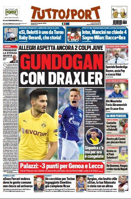 Il mercato della Juve in primo piano oggi, venerdì 14 agosto, sulla prima pagina di Tuttosport: “Gundogan con Draxler. Allegri aspetta ancora 2 colpi“. Per le milanesi invece: “Inter, Mancini ne chiede 4. Sogno Milan: Bacca più Ibra“.