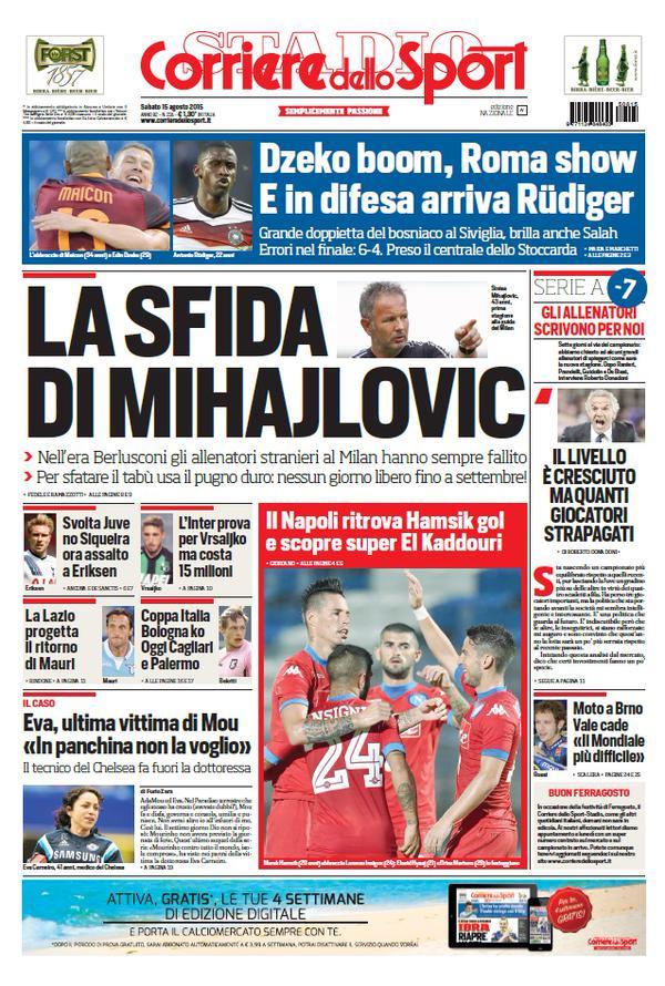 “La sfida di Mihajlovic“, è questo il titolo dedicato al Milan in prima pagina sull’edizione di oggi, sabato 15 agosto, del Corriere dello Sport. In taglio alto la Roma che in amichevole batte il Siviglia per 6-4: “Dzeko boom, Roma Show. E in difesa arriva Rudiger“.