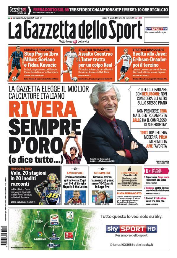 “Rivera sempre d’oro“, è questo il titolo in primo piano oggi, sabato 15 agosto, sulla Gazzetta dello Sport. Per la rosea l’ex fantasista rossonero è il miglio calciatore italiano di sempre. In taglio basso le amichevole di Roma (vittoriosa per 6-4 con il Siviglia, con 2 gol di Dzeko), e Napoli (5-0 al Latina).