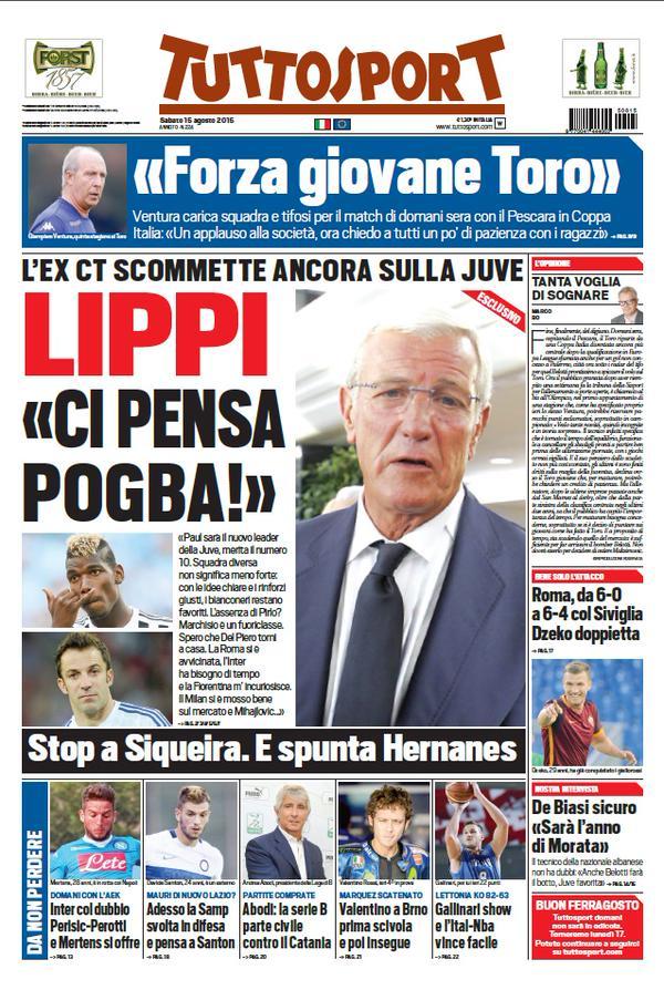 Intervista al CT campione del mondo 2006, Marcello Lippi, sulla prima pagina di oggi, sabato 15 agosto, di Tuttosport: “Ci pensa Pogba, l’ex CT scommette ancora sui bianconeri per la conquista dello scudetto“. Di spalla la travolgente Roma di Garcia che in amichevole batte il Siviglia per 6-4, doppietta per il neo acquisto Edin Dzeko.