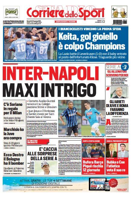 In taglio alto la vittoria della Lazio nel play-off di Champions League contro il Bayer Leverkusen: “Keita, gol gioiello è colpo Champions“. Chiusura sul Milan che ha messo nel mirino Soriano della Samp.