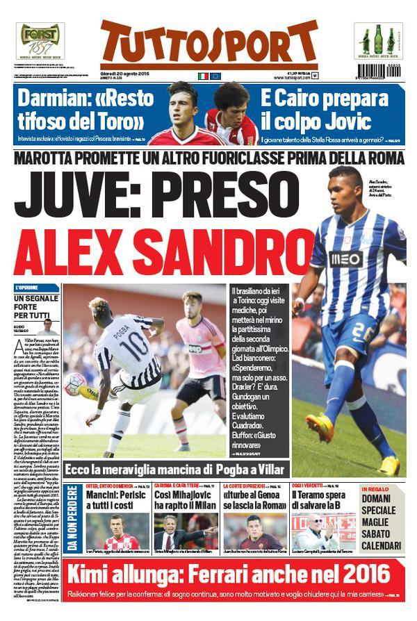 Mercato targato Juventus in prima pagina oggi, giovedì 20 agosto, su Tuttosport: “Juve, preso Alex Sandro. Marotta promette un altro fuoriclasse“. In taglio alto il mercato del Torino: “Cairo prepara il colpo Jovic dalla Stella Rossa“.