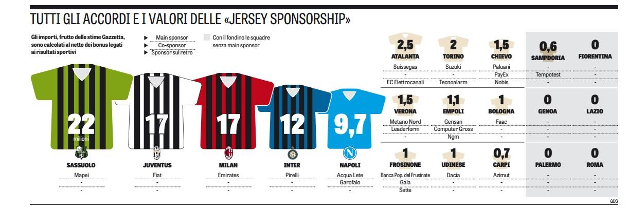 La Gazzetta dello Sport, in edicola questa mattina, ha fatto il punto della situazione in merito ai ricavi economici delle squadre di Serie A legati agli sponsor di maglia.