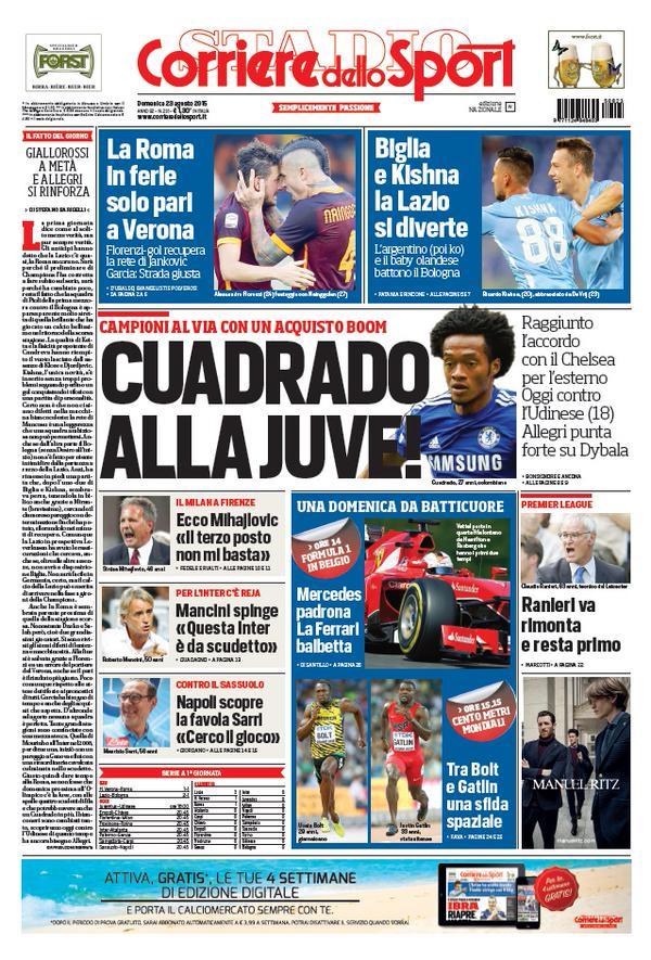 “Cuadrado alla Juve!“, è questo il titolo in primo piano oggi, domenica 23 agosto, sulla prima pagina del Corriere dello Sport. E ancora: “Accordo raggiunto con il Chelsea per l’esterno“. In taglio alto i risultati degli anticipi di Roma (fermata per 1-1 al Bentegodi dal Verona) e Lazio (vittoriosa per 2-1 contro il Bologna all’Olimpico).