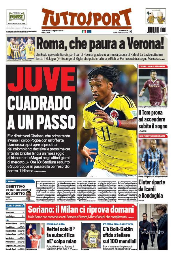 Il mercato della Juventus in primo piano oggi, domenica 23 agosto, in prima pagina su Tuttosport: “Juve, Cuadrado a un passo“. I londinesi prima ci provano per Pogba e poi aprono al prestito del colombiano. In taglio alto i risultati degli anticipi della prima giornata: “Roma, che paura a Verona! Jankovic spaventa Garcia, poi il pari di Florenzi grazie a una mezza papera di Rafael. La Lazio soffre ma supera il Bologna (2-1, ndr)”.
