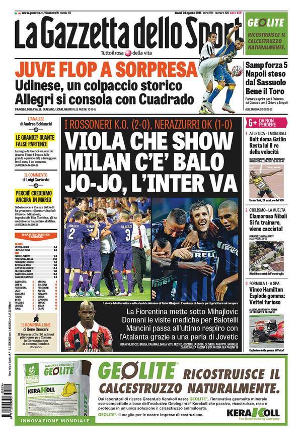 Primo piano dedicato al risultato delle milanesi in questa prima giornata di campionato, sulla prima pagina di oggi, lunedì 24 agosto, della Gazzetta dello Sport: “Viola che show, rossoneri k.o (2-o, ndr). Milan c’è Balo, domani le visite mediche. Jo-Jo, l’Inter va (nerazzurri ok 1-0 all’Atalanta)”.